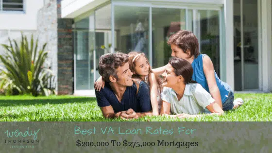 The Wendy Thompson lending team will evaluate your credit history and debt to income ratio to help you get the best VA loan rates for $275,000, $285,000 and $295,000 mortgages.